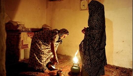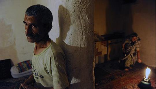 Mashallah, returning tired from a long days of work, enters the kitchen and with a concerned look to the picnic stove being on for too long, is staring at the fire. He wants to drink a cup of water and smoke a cigarette.