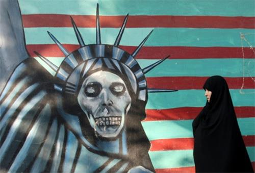 An Iranian woman walks past a mural on the wall of the former US embassy in the Iranian capital Tehran on November 9, 2016