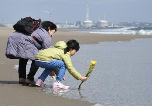 A girl and her grandmother put flowers on the beach in Sendai on March 11, 2016
