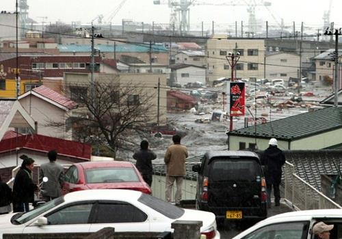 A Shiogama City resident Akira Shibahara took this photo on March 11, 2011 of people watching a tsunami wave engulfing vehicles and houses in the Miyagi prefecture town after the area was hit by a massive 8.9 magnitude earthquake