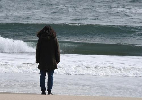 A woman looks out to sea in Sendai on March 11, 2016 as people gather to remember the victims of the massive earthquake and tunami disaster that hit northeastern Japan in 2011