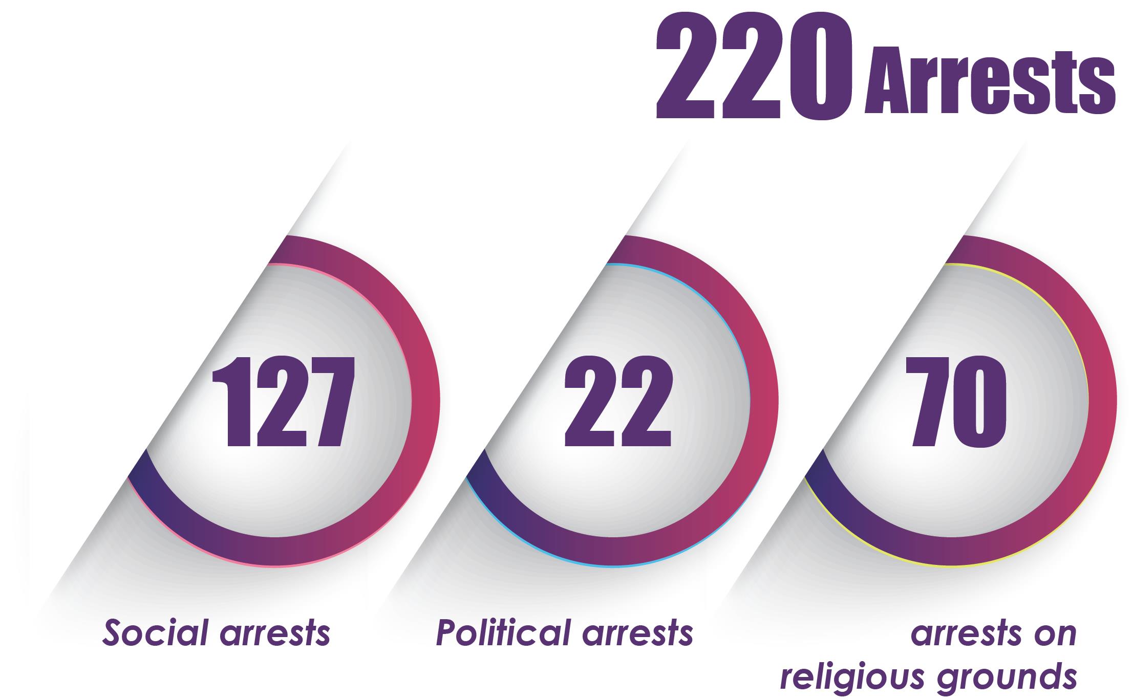 The number of arrests registered in the month of August was at least 220 including 127 social arrests, 22 political arrests and 70 arrests on religious grounds.