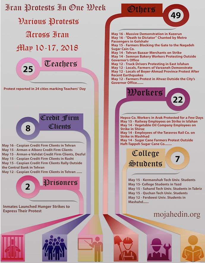 Iran, May 24, 2018 – In December, protests that erupted in the eastern city of Mashhad over unemployment, poverty and government corruption quickly turned into a nationwide protest across Iran. Although the regime brutally cracked down on the protesters, tensions continued to simmer and manifest themselves in smaller yet constant protests in other parts of the country.