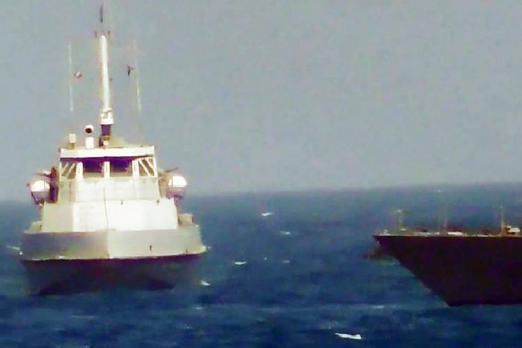 A video grab from the U.S. Navy shows an Iranian vessel heading toward the USS Thunderbolt in the Persian Gulf in July, 2017.
