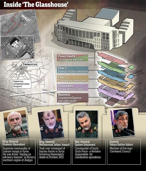 Opposition activists have claimed that Iran is waging a secret war in Syria from a giant HQ nicknamed ‘the Glasshouse’