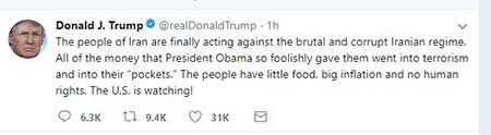 US president Donald Trump once again on Tuesday, Jan. 2, 2018 expressed his government support for the Iranian people uprisings. In his tweet, president Trump wrote: