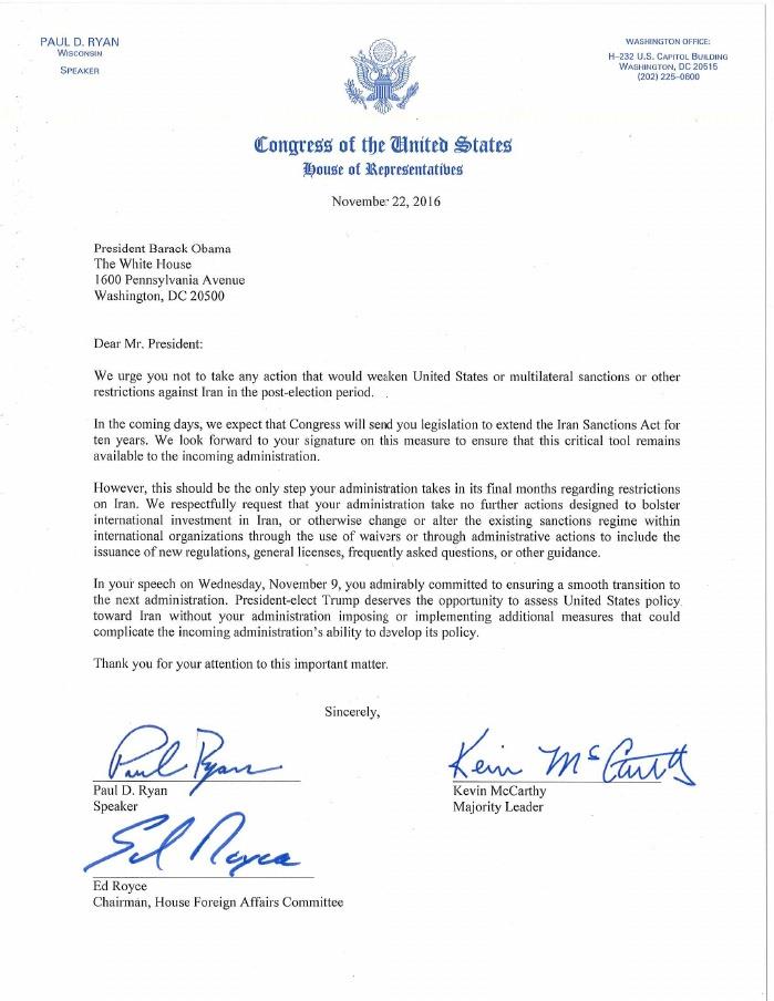 Washington Examiner, 22 Nov. 2016– House GOP leaders on Tuesday asked President Obama to refrain from planning “new concessions” to Iran under the nuclear agreement during the remainder of his term, after reports that he is looking for ways to entice Iran to adhere to the deal.