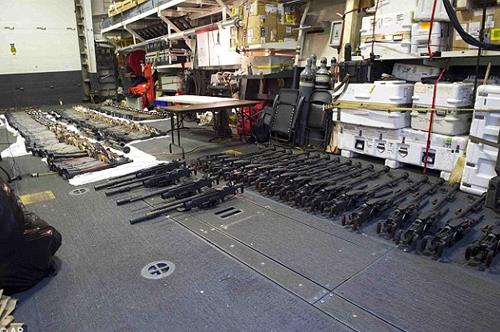 The weapons seized last week by the warships Sirocco and Gravely were hidden on a small dhow and included 1,500 AK-47 rifles, 200 rocket-propelled grenade (RPG) launchers, and 21 .50-caliber machine guns, according to the Navy statement.
