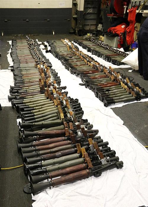 It cited a Feb. 27 incident in which the Australian Navy intercepted a dhow in late February and confiscated nearly 2,000 AK-47s, 100 RPG launchers, and other weapons. On March 20, a French destroyer seized almost 2,000 AK-47s, dozens of Dragunov sniper rifles, nine antitank missiles, and other equipment.