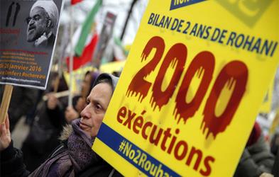 Paris – AP – Jan. 28 – Supporters of Maryam Rajavi, President of the National Council of Resistance of Iran, demonstrate against Iranian President Hassan Rouhani’s visit in Paris.