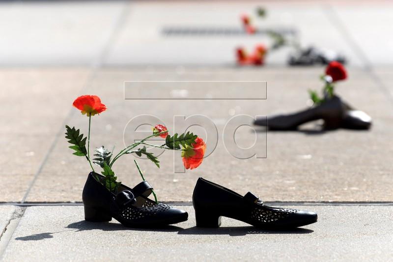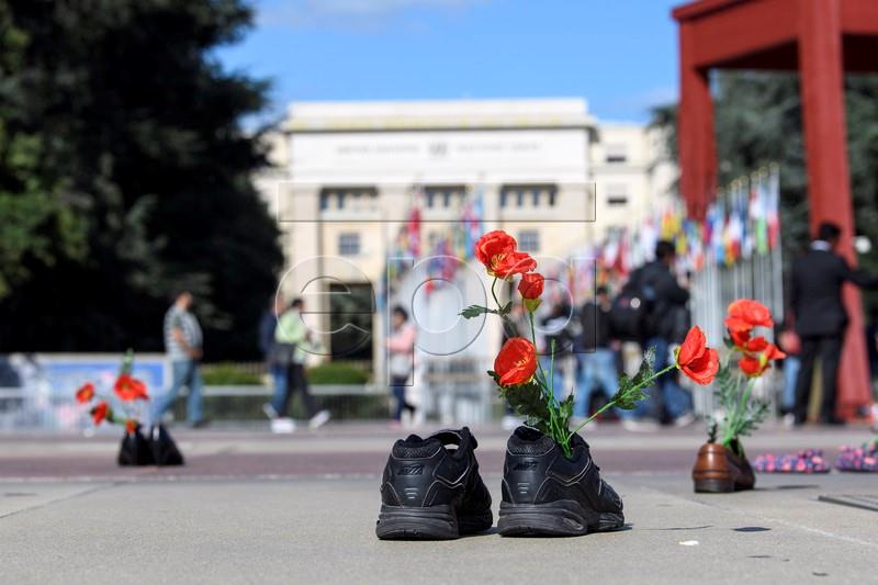 EPA, Sept. 16, 2017 – Shoes with flowers that represent the victims of the 1988 Massacre of political prisoners in Iran are on display during an exhibition at the Palais des Nations in front of the United Nations (UN) European Headquarters in Geneva, Switzerland, 15 September 2017. In the summer of 1988, some 30,000 Iranian political prisoners were massacred in a matter of a few months on the basis of a fatwa issued by Ruhollah Khomeini, the founder of the Islamic Republic. Human rights organizations and jurists are demanding the UN to conduct an independent international investigation of the 1988 massacre.