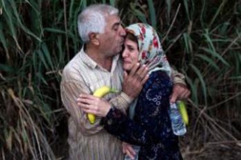 A photograph of a migrant woman crying with a relative by AFP’s Angelos Tzortzinis