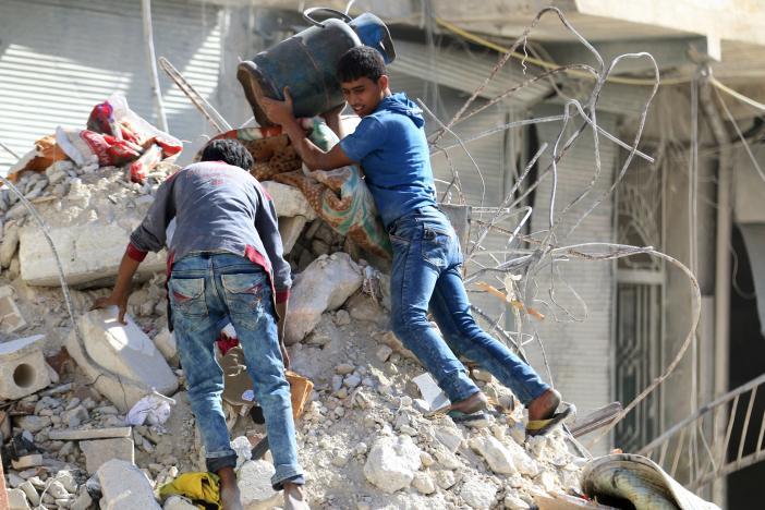 People remove belongings from a damaged site after an air strike Sunday in the rebel-held besieged al-Qaterji neighbourhood of Aleppo, Syria October 17, 2016.