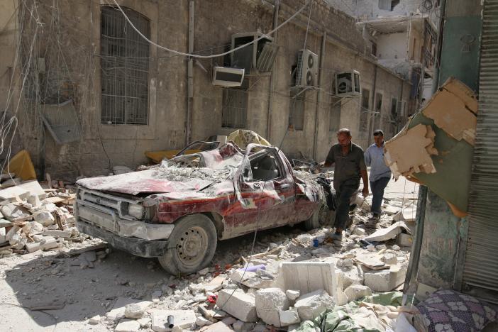 People walk near a damaged vehicle after an air strike Sunday in the rebel-held besieged al-Qaterji neighbourhood of Aleppo, Syria October 17, 2016.