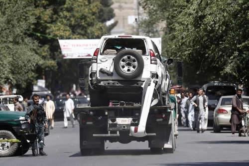 A damaged vehicle is removed from the scene of a suicide bomb attack Wednesday in Kabul, Afghanistan’s capital.