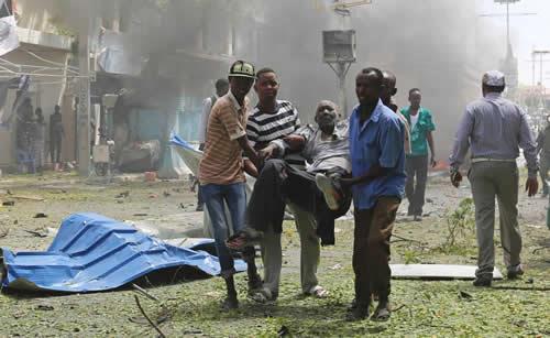 Rescuers carry an injured man from the scene of an explosion in Mogadishu