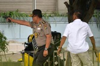 An Indonesian policeman fires his handgun towards suspects outside a cafe after a series of blasts