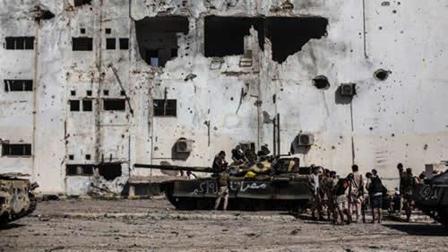 Fighters affiliated to the Tripoli government rest and reload weapons during an offensive against IS militants in Sirt, Libya.