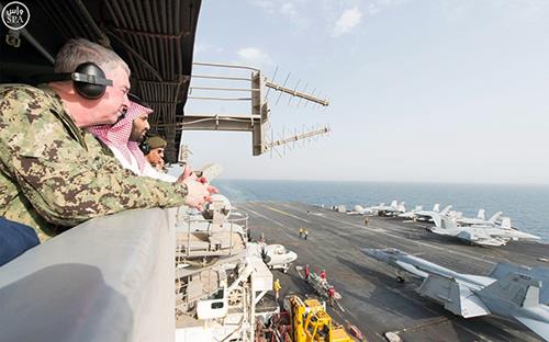 Saudi Arabia’s Deputy Crown Prince Mohammed bin Salman toured the nuclear-powered aircraft carrier USS Theodore Roosevelt underway in the Gulf today. Prince Mohammed, who also serves as Defense Minister, was briefed on the capabilities and operating procedures of the ship and its embarked air wing and he observed aviation operations on the 97,000 ton supercarrier’s 4.5 acre flight deck. Rear Admiral Andrew Lewis, who commands “Strike Group 12″ including the carrier, its embarked air wing and its escort vessels, briefed Prince Mohammed “on its administrative organizational structure, operating systems, radar technology used and remote sensing instruments in addition to a briefing about Theodore Roosevelt’s daily combat operations management” according to SPA.