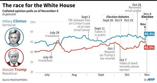 AFP, Nov. 6, 2016 – The FBI on Sunday lifted the threat that Hillary Clinton might face charges over her private email server — another campaign bombshell just 36 hours before her White House showdown with Donald Trump.