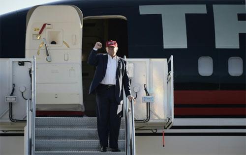 Republican presidential nominee Donald Trump arrives for a rally at the Sun Country Airlines hangar in Minneapolis, Minnesota on November 6, 2016