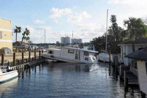 A boat is partially submerged in the Halifax River in the aftermath of Hurricane Matthew in Daytona Beach, Florida, U.S. October 9, 2016.