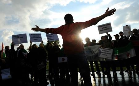 Protesters hold signs during a demonstration in Berlin against the bombing of Aleppo ahead of a meeting of leaders of Russia, France and Germany ©Steffi Loos (AFP)