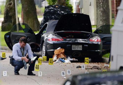 A Houston Police Department investigator photographs a vehicle that was damaged by gunshots at the scene where nine were wounded in a strip mall shooting on early Monday morning.