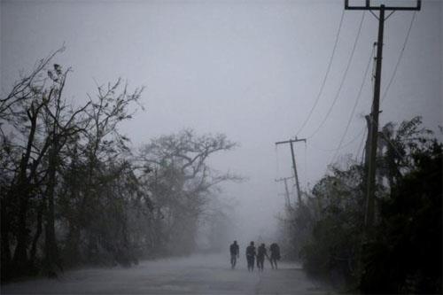 People walk on the road as rain falls during Hurricane Matthew in Les Cayes, Haiti.