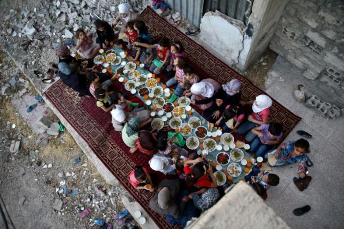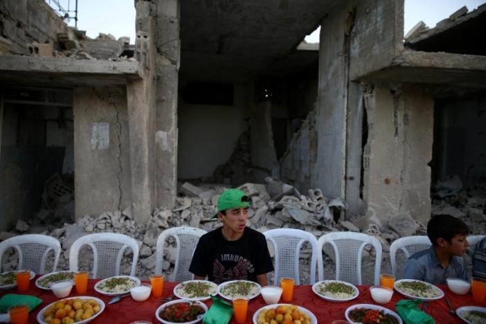 DOUMA, SYRIA, Reuters, Jun 23, 2017— Against a backdrop of crumbling buildings in the rebel-held Douma district east of Damascus, hungry Syrians sat down together on the rubble-strewn streets to break fast with a free Ramadan meal.