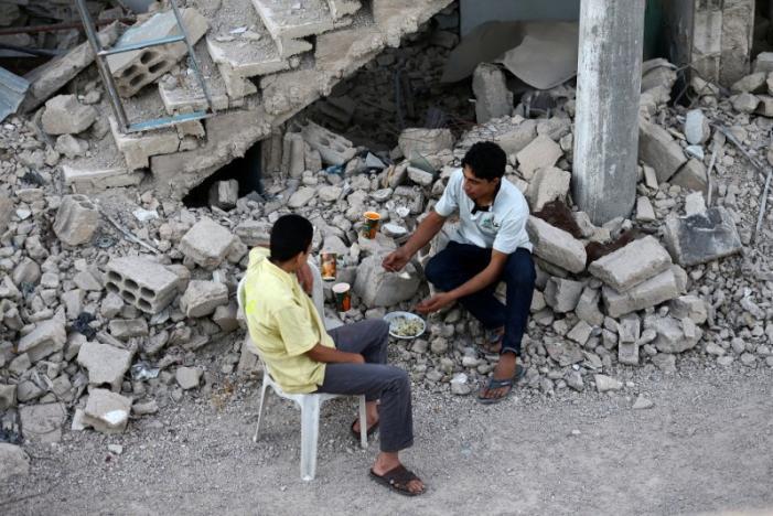 A worker (R) of Adaleh Foundation breaks his fast amidst damaged buildings during the holy month of Ramadan in the rebel-held besieged town of Douma to the east of Damascus, Syria, June 18, 2017