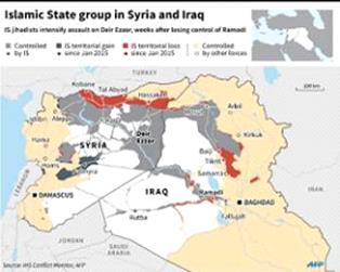 Map of Syria and Iraq showing areas controlled by IS