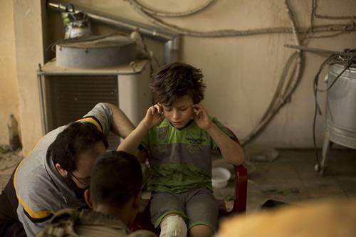 In this photo taken on Tuesday, May 16, 2017, Hadi, 10, plugs his ears during heavy fighting close to his home, as an Iraqi special forces medic treats his wounds from a blast in western Mosul, Iraq.