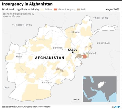 Map showing areas of influence of the Taliban and IS Group in Afghanistan