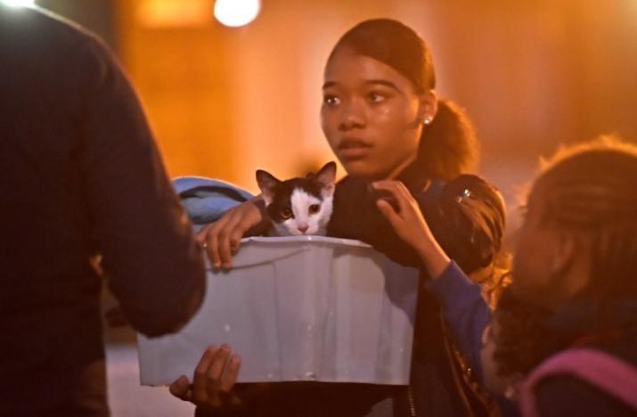 Emerging into the streets on a hot night, residents clutched children, pets and small amounts of clothing and food to try to find a bed in a local hotel or with family or friends. Many were directed to inflatable beds laid out on the floor of the local sports hall.