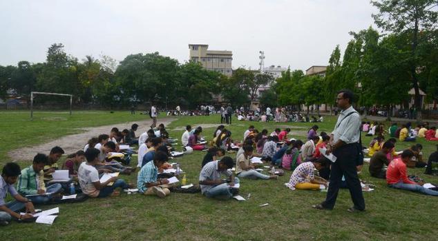 Indian college students write examination papers as they sit on a field in Siliguri,