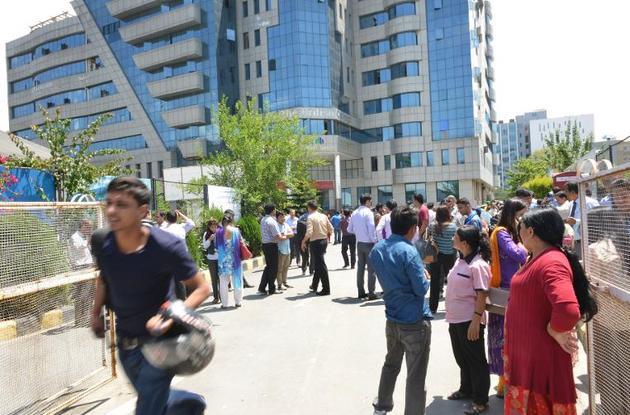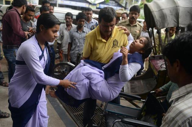 Indian hospital staff attend to a schoolgirl who fainted as a tremor struck Siliguri,