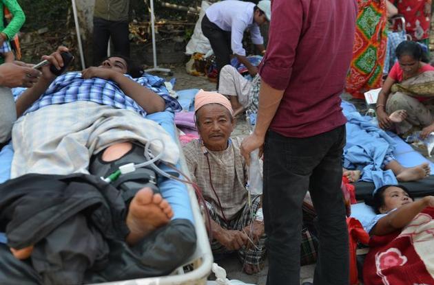 Nepalese patients lie on stretchers in an open area after being carried out of a hospital building as a powerful earthquake hits Kathmandu