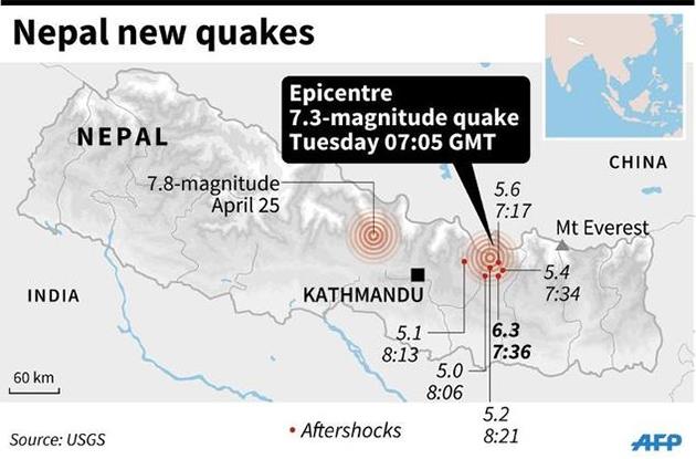 The 7.3-magnitude quake struck at 12:35 pm, some 76 kilometres (47 miles) east of Kathmandu, the US Geological Survey said, more than two weeks after a 7.8-magnitude quake which killed more than 8,000 people.