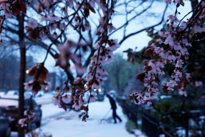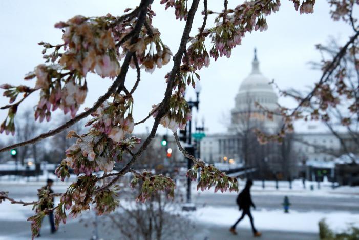 The storm left Washington’s celebrated cherry trees, a tourist attraction and an early herald of spring, encased in ice.