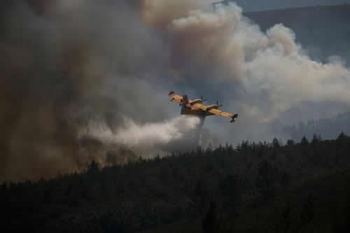 A firefighting plane dumps water on a forest fire in Cadafaz, near Gois, Portugal, June 20, 2017.