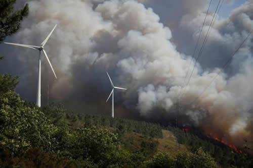 Fire and smoke are seen beside wind turbines during a forest fire in Cadafaz, near Gois, Portugal, June 20, 2017.