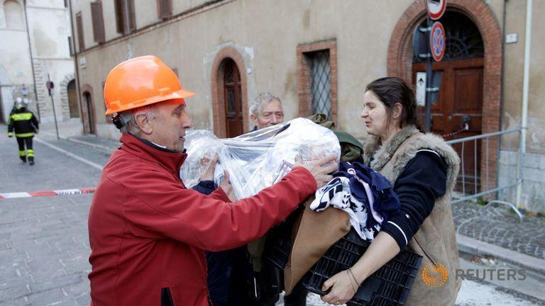 A woman carries her belongings after an earthquake in Visso, central Italy, October 27, 2016.