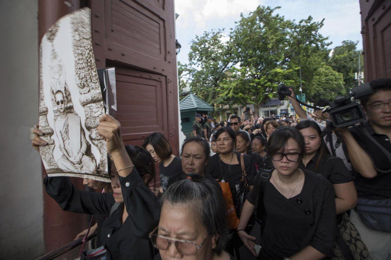 People sat four to five rows deep on both sides of the road, sobbing openly and bowing as the convoy passed. Most held portraits of the king in regal yellow robes. Some pulled currency notes from their wallets: all bank notes carry the king’s face. Many had camped 24 hours since Thursday.