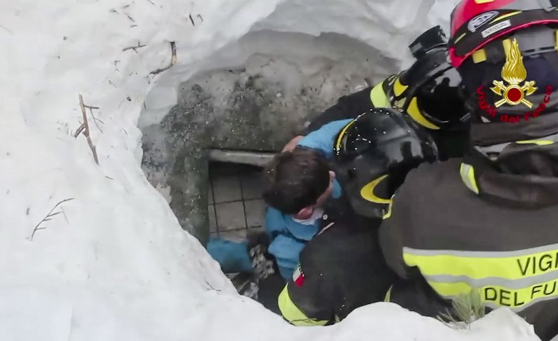 This frame from video shows Italian firefighters extracting a person alive from under snow and debris of an hotel that was hit by an avalanche on Wednesday,