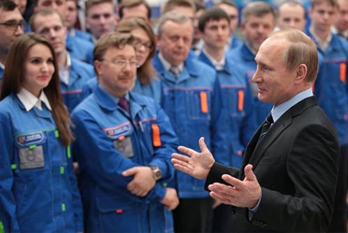 Vladimir Putin talks to employees of the 70th Victory Day Anniversary Plant in Nizhny Novgorod, March 29, 2016.