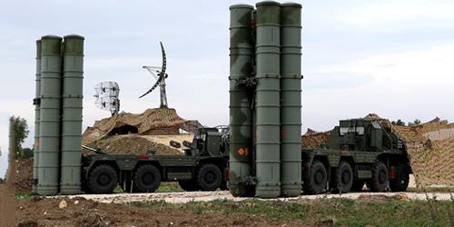 A picture shows two Russian S-400 Triumf missile systems at the Russian Hmeymim military base in Latakia province, in the northwest of Syria