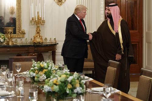 President Donald Trump shakes hands with Saudi Defense Minister and Deputy Crown Prince Mohammed bin Salman, Tuesday, March 14, 2017, in the State Dining Room of the White House in Washington.