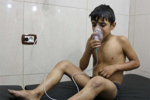 A Syrian boy suffering from breathing difficulties after helicopters were said to have dropped barrel bombs on Sukari