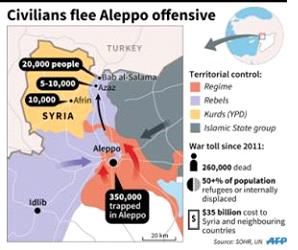 Map of Aleppo province showing displacements of civilians and regime offensive to retake Aleppo